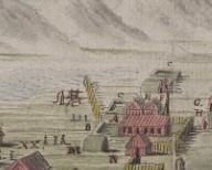 Image of Reykjavik as it looked in 1785. Left: View of Kvosin seen from the harbor towards the pond. Right: A cropped and zoomed in image. The letter A shows the church and the letter B shows the location of the cemetery. The corner of the church where the letter H is, shows the corner of Aðalstræti and Kirkjustræti.